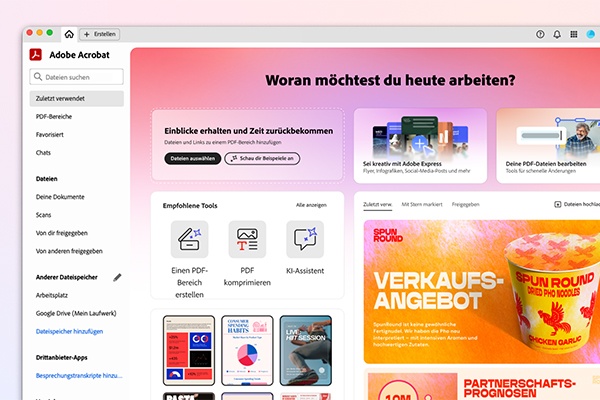 Acrobat Studio bringt die wichtigsten Werkzeuge für den Marketingalltag in einer Plattform zusammen: Dokumentenbearbeitung, Analysefunktionen, visuelle Content-Erstellung und KI-basierte Unterstützung. Herzstück der Lösung sind PDF Spaces – digitale Arbeitsräume, in denen Dateien verschiedener Formate, Links und Notizen zu einem Thema oder Projekt gebündelt werden können. PDF Spaces funktionieren wie digitale Schreibtische: Briefings, Präsentationen, Reportings und Creatives lassen sich kontextbezogen organisieren und gemeinsam bearbeiten. Alle Projektbeteiligten können zeitgleich auf dieselben Unterlagen zugreifen, neue Inhalte hinzufügen, Fragen stellen und kommentieren.