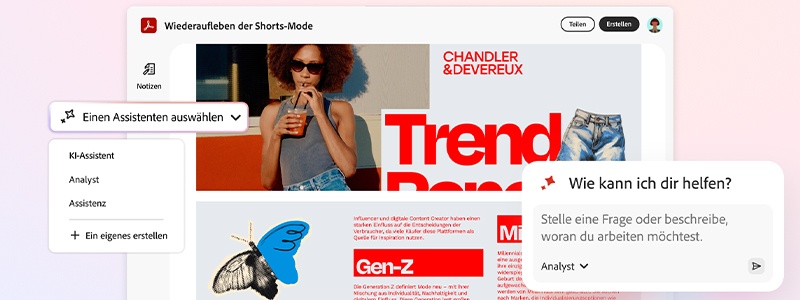 So entstehen durchgängige Workflows während des gesamten Projekts: Zielgruppenanalysen, Performance-Daten vergangener Kampagnen und Marktanalysen werden in PDF Spaces zusammengeführt und mithilfe von KI-Assistenten effizient ausgewertet. Basierend darauf entstehen kollaborativ die Kernbotschaften der Kampagne, erste visuelle Entwürfe folgen unmittelbar. Präsentationen, Trendreports oder Whitepaper lassen sich direkt im gleichen Umfeld entwickeln, kommentieren und finalisieren – für unkomplizierte Abstimmung und Freigaben.